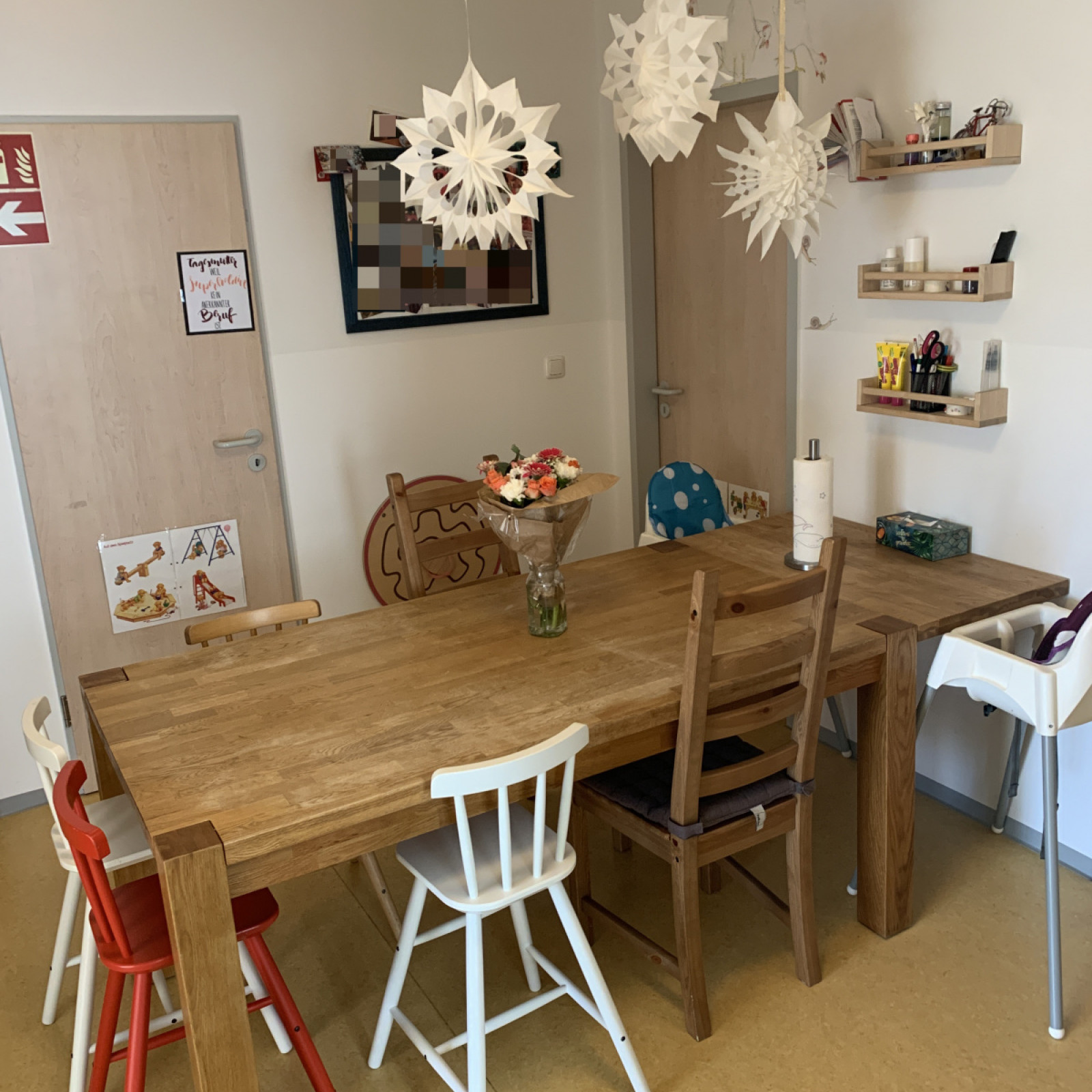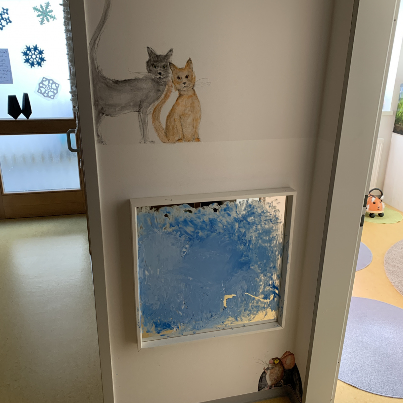 An dem Tisch werden auch unsere Bastel- und Malaktionen gemacht. Die Kinder können in Ruhe sitzen und sich auf ihr Projekt konzentrieren, während andere im Spielzimmer toben. Auch werden mal Einrichtungsgegenstände direkt verwendet, z.B. wird der Spiegel in ein Schneegestöber verwandelt mit blauer und weißer Fingerfarbe.