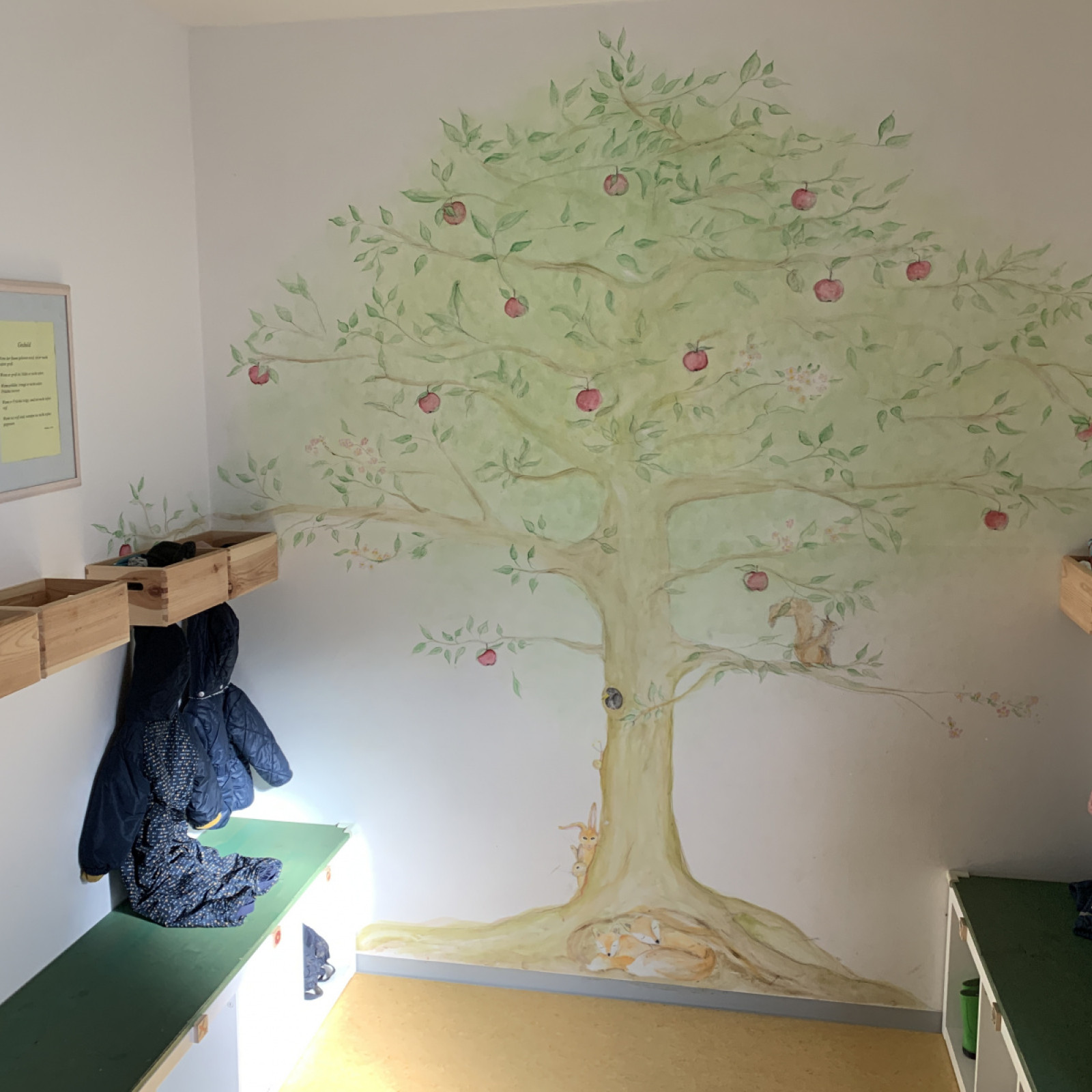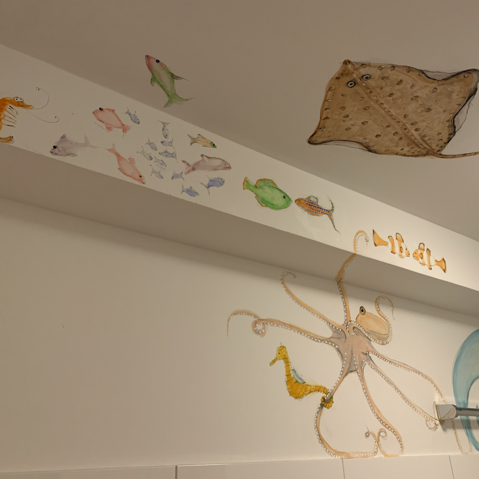 Sobald die Kleinen klettern können, dürfen sie selbstständig (unter Aufsicht) auf den Wickeltisch klettern. Dafür haben wir unsere Treppe, die auch den Zugang zum Waschbecken ermöglicht. Diese wird von den Kindern gerne und viel genutzt. Während dem Wickeln können sie dann auch die großen Fische an der Decke bestaunen.