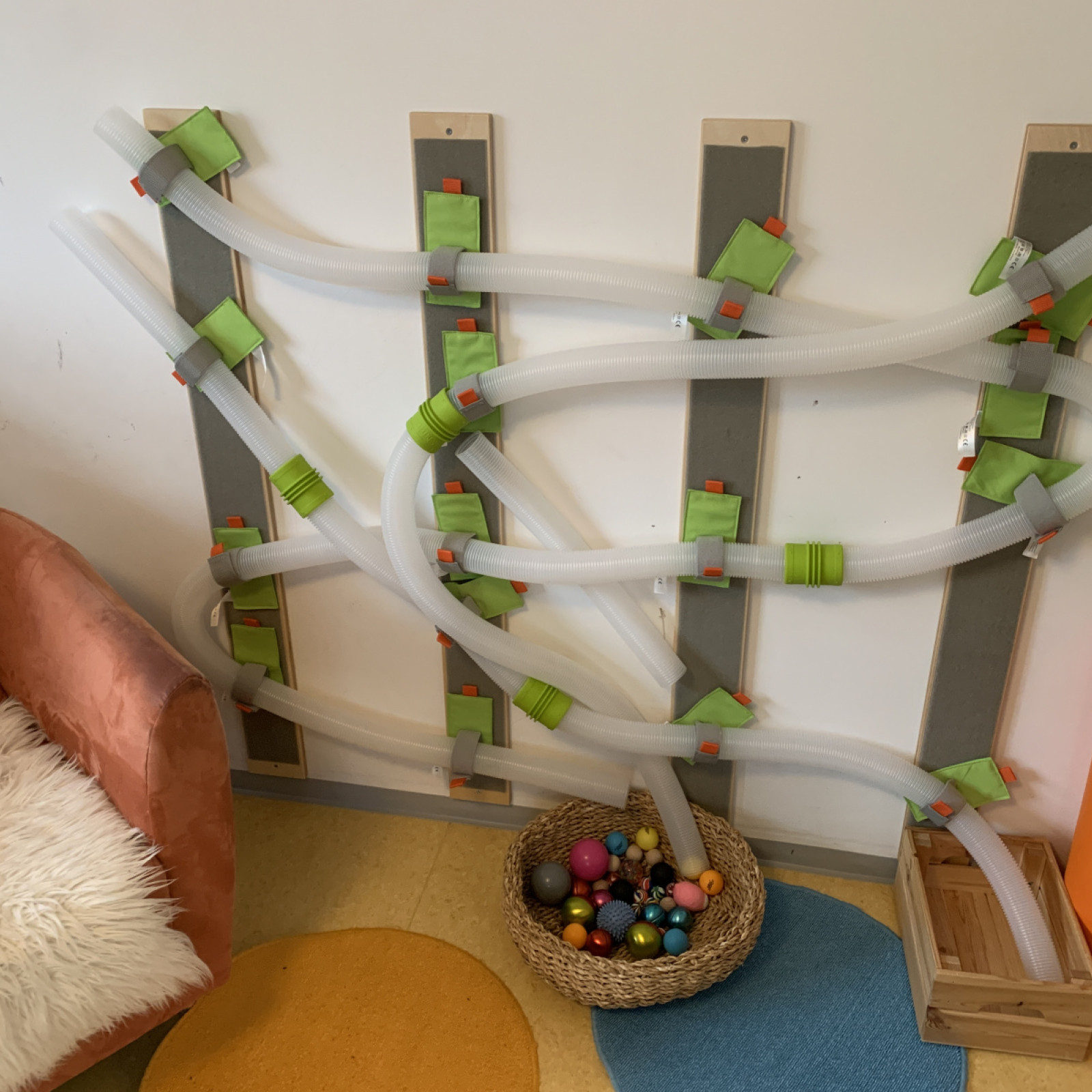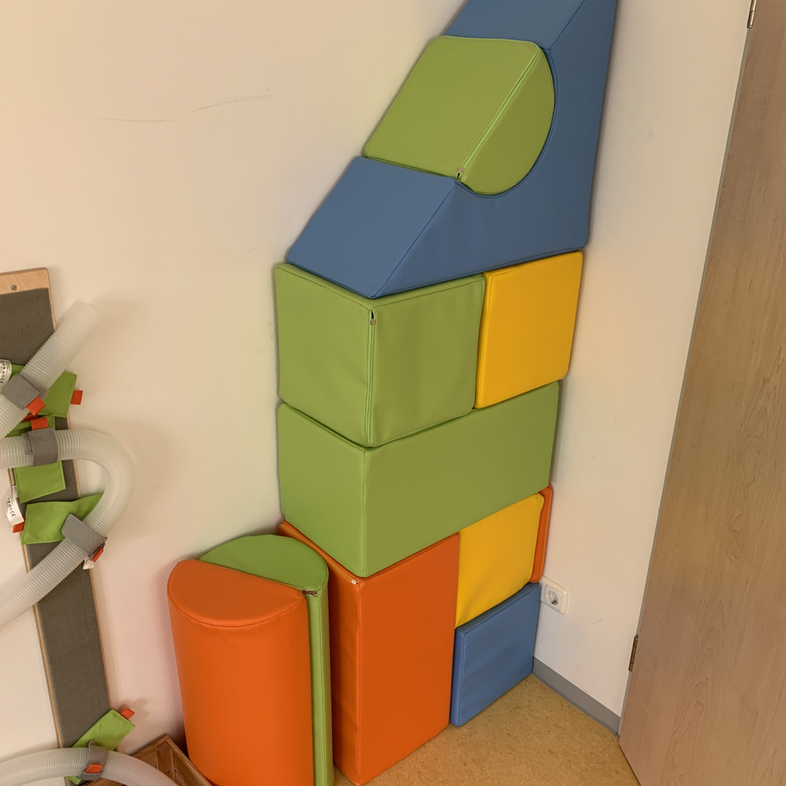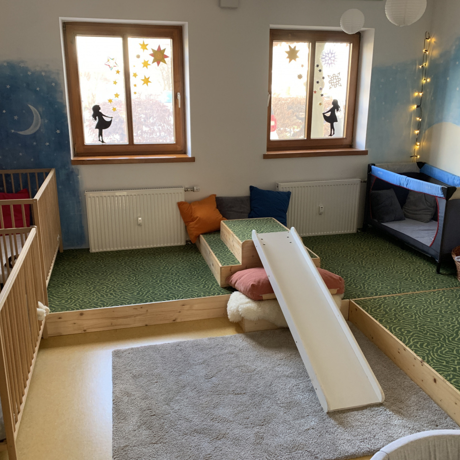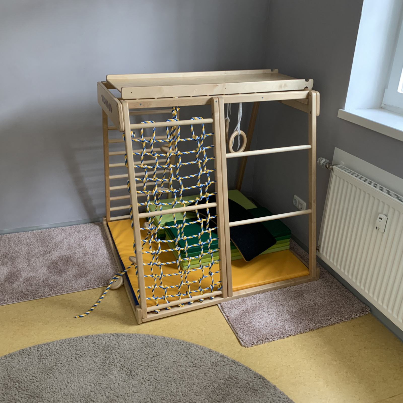 Wir haben das Zimmer bewusst ohne Spielzeug ausgestattet und sind auch dahinter, dass die Spielsachen im Spielzimmer bleiben. Dieser Raum soll durch die verschiedenen Ebenen zum Klettern und Turnen animieren. Die Rutsche ist dabei natürlich ein Magnet. Wenn diese nicht eingehängt ist, werden auch mal Matratzen ausgelegt, so dass die Kinder von oben (unter Aufsicht und Hilfestellung) runterspringen können.