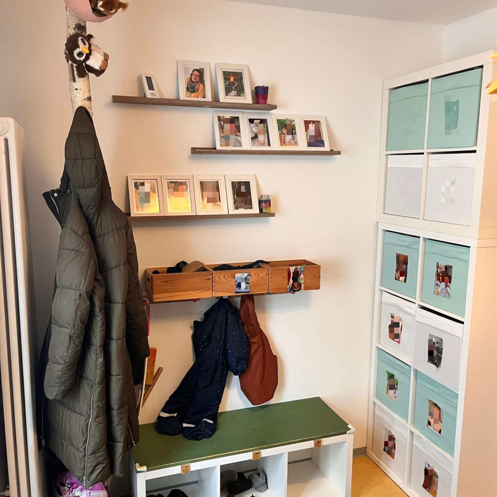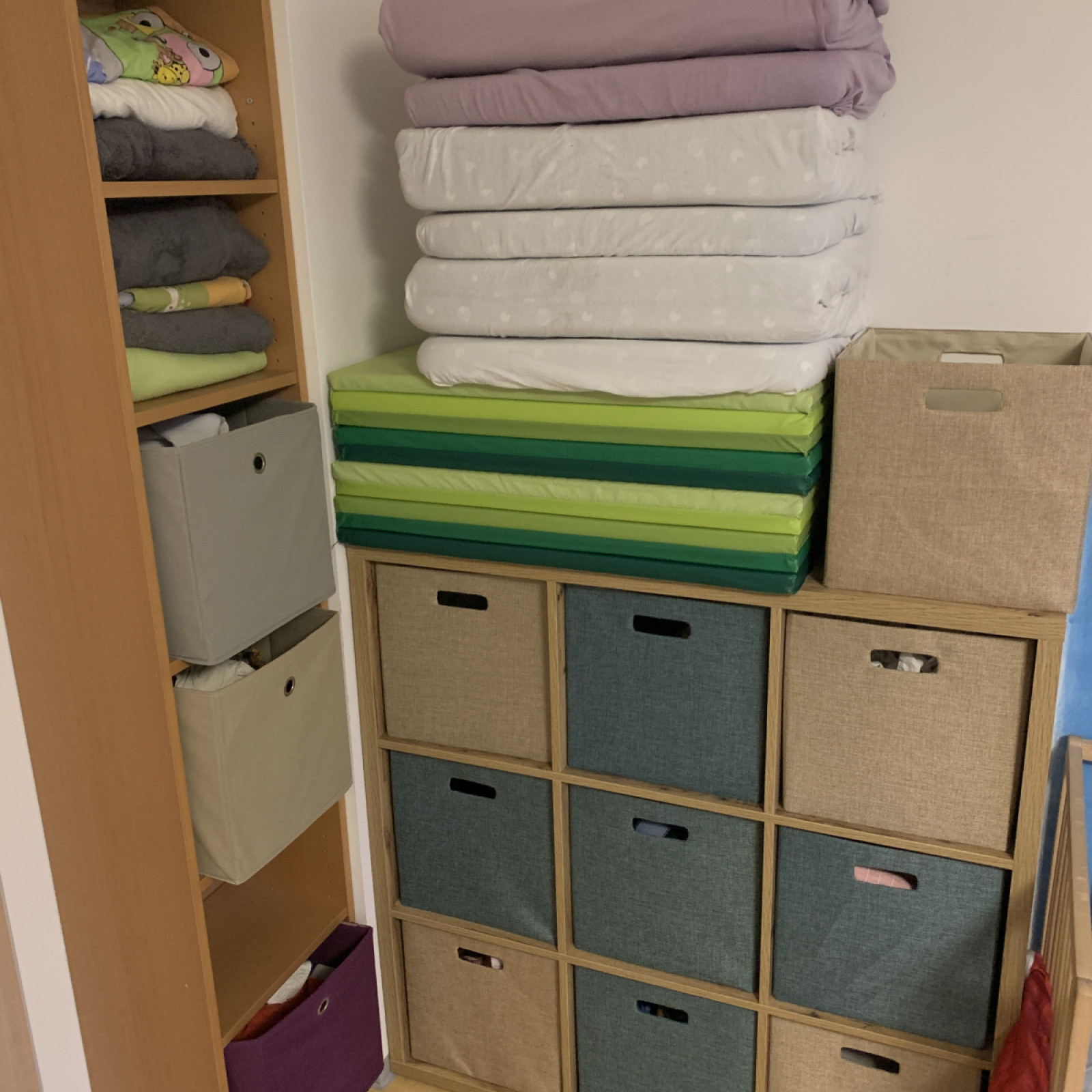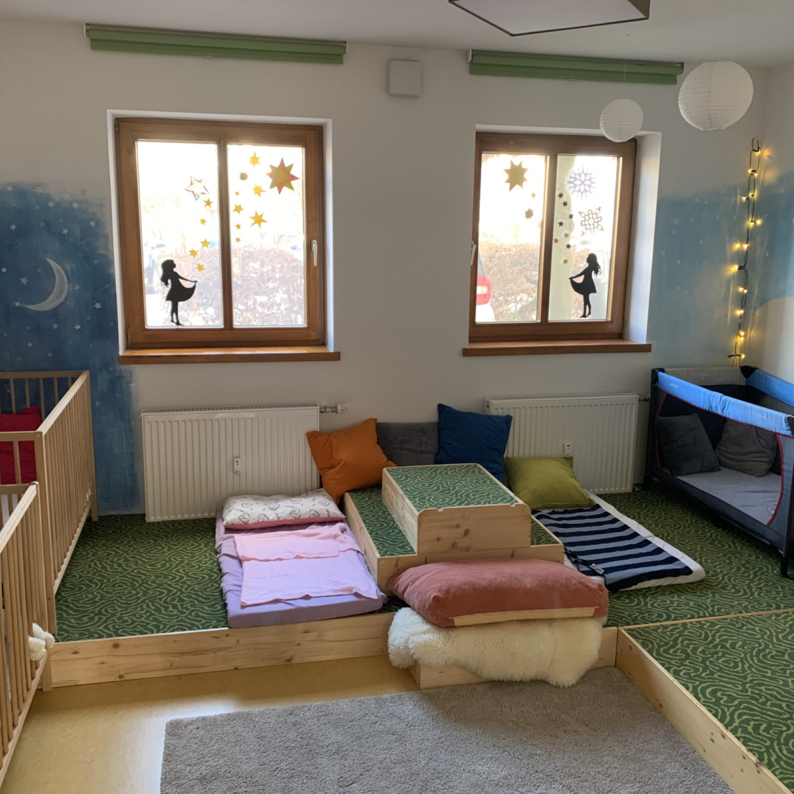 Zur Mittagszeit geht es dann für alle gemeinsam ins Bett zum Schlafen. Die Kleinsten dürfen im Gitterbett oder den Krippenkörbchen schlafen und für die Größeren werden Matratzen ausgelegt. Durch die Verdunkelungsrollos kann das Zimmer fast komplett abgedunkelt werden, so dass alle Kinder zur Ruhe kommen. Auch steht hier wieder ein Regal, in dem jedes Kind sein Fach für die eigenen Schlafsachen hat. Eine von uns beiden ist zur Schlafwache mit im Zimmer.
