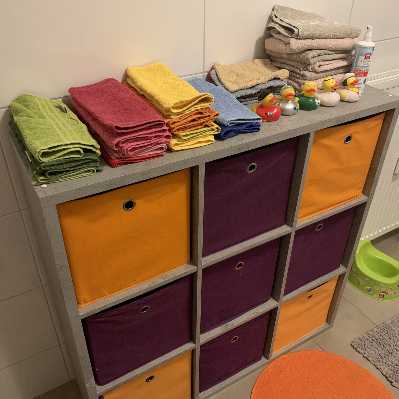 Auch im Bad steht ein Regal, in dem jedes Kind sein Fach für die eigenen Wickelsachen und Pflegeprodukte hat. Um Hautausschläge zu verhindern, dürfen wir nur Produkte verwenden, die uns die Eltern mitbringen.