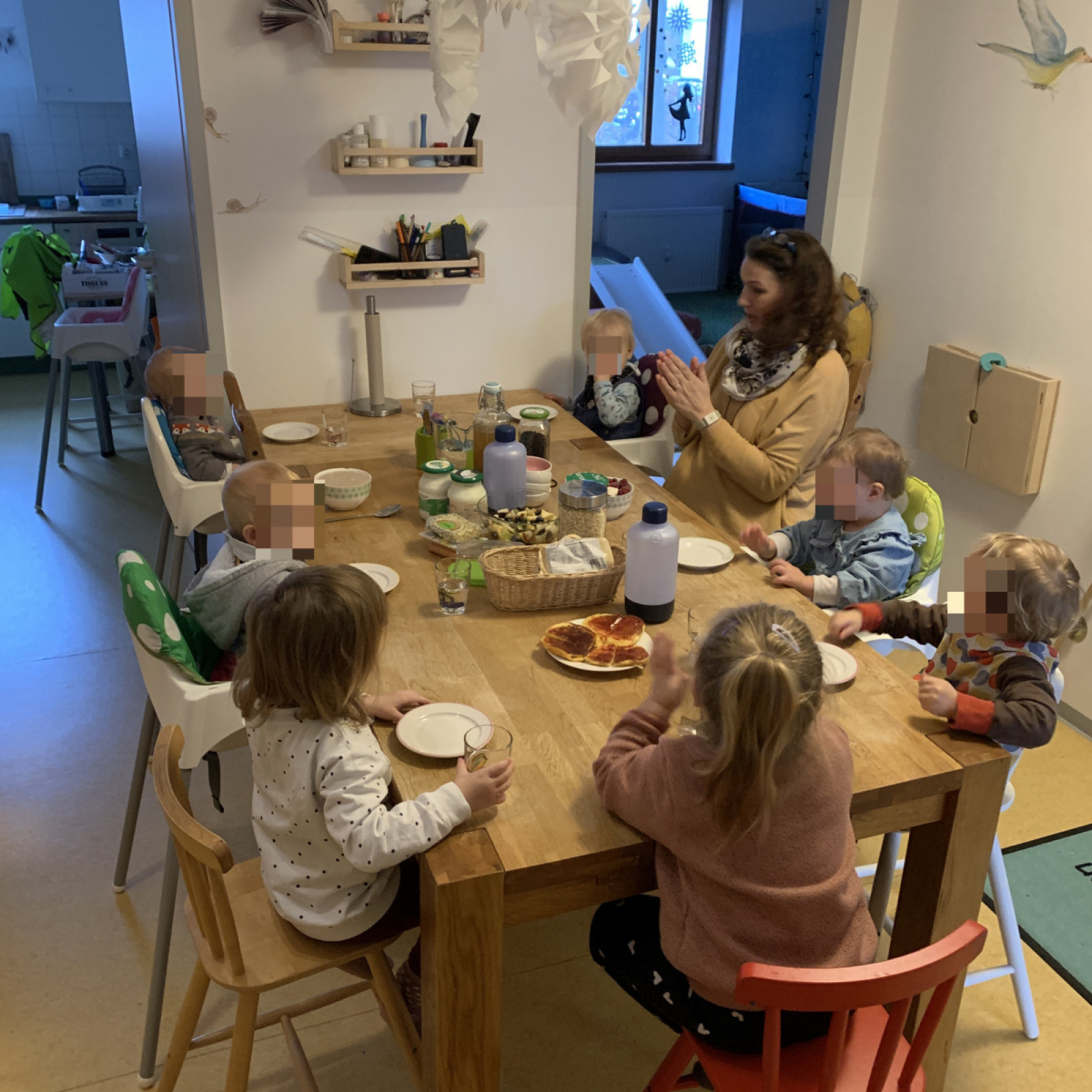 Wenn dann alle da sind, machen wir einen Morgenkreis mit Fingerspielen und Liedern. Auch werden dann gemeinsame Spiele und Aktionen unter Anleitung gemacht. Später wird gemeinsam alles aufgeräumt und es geht zur Brotzeit an den Esstisch. Im Anschluss geht es raus an die frische Luft.
