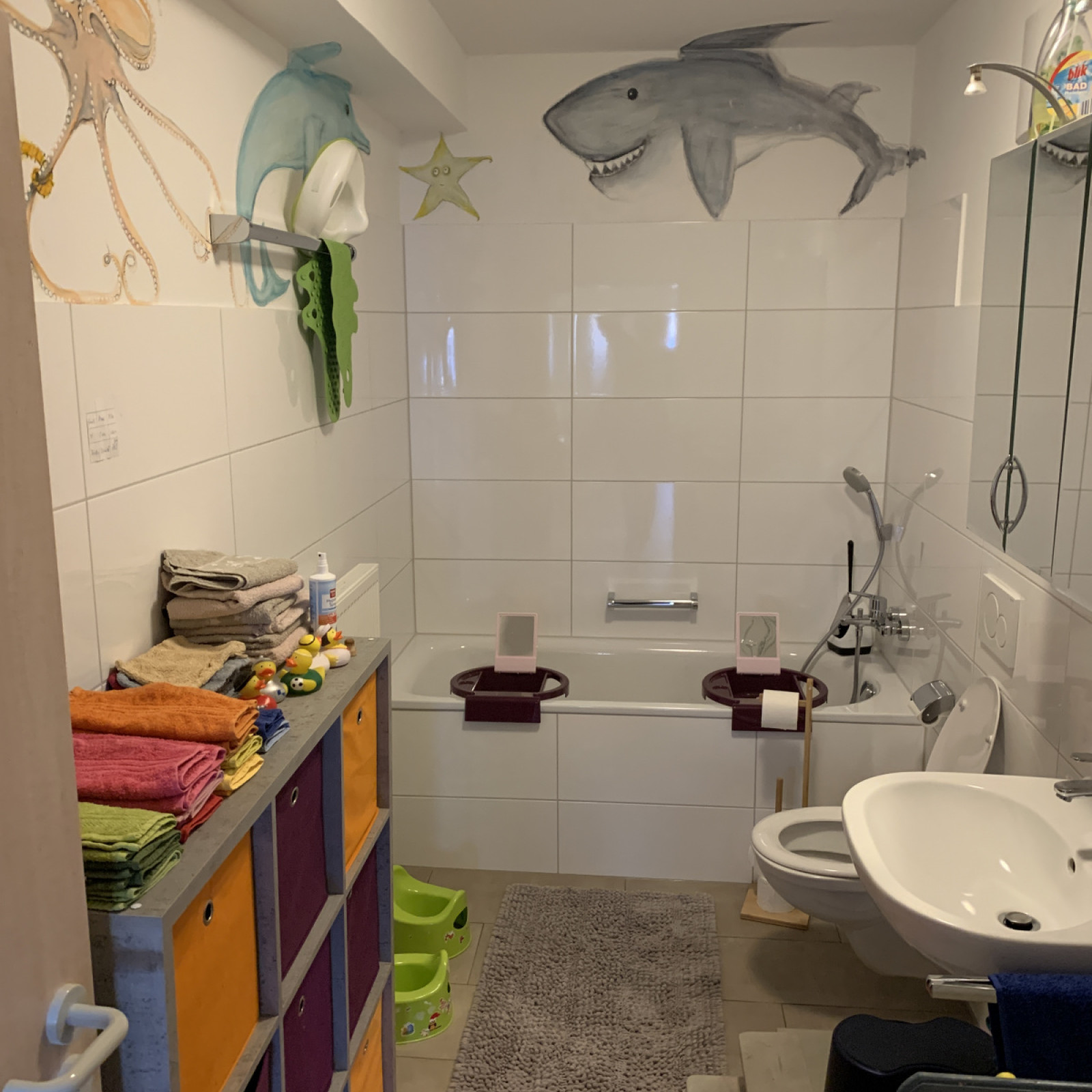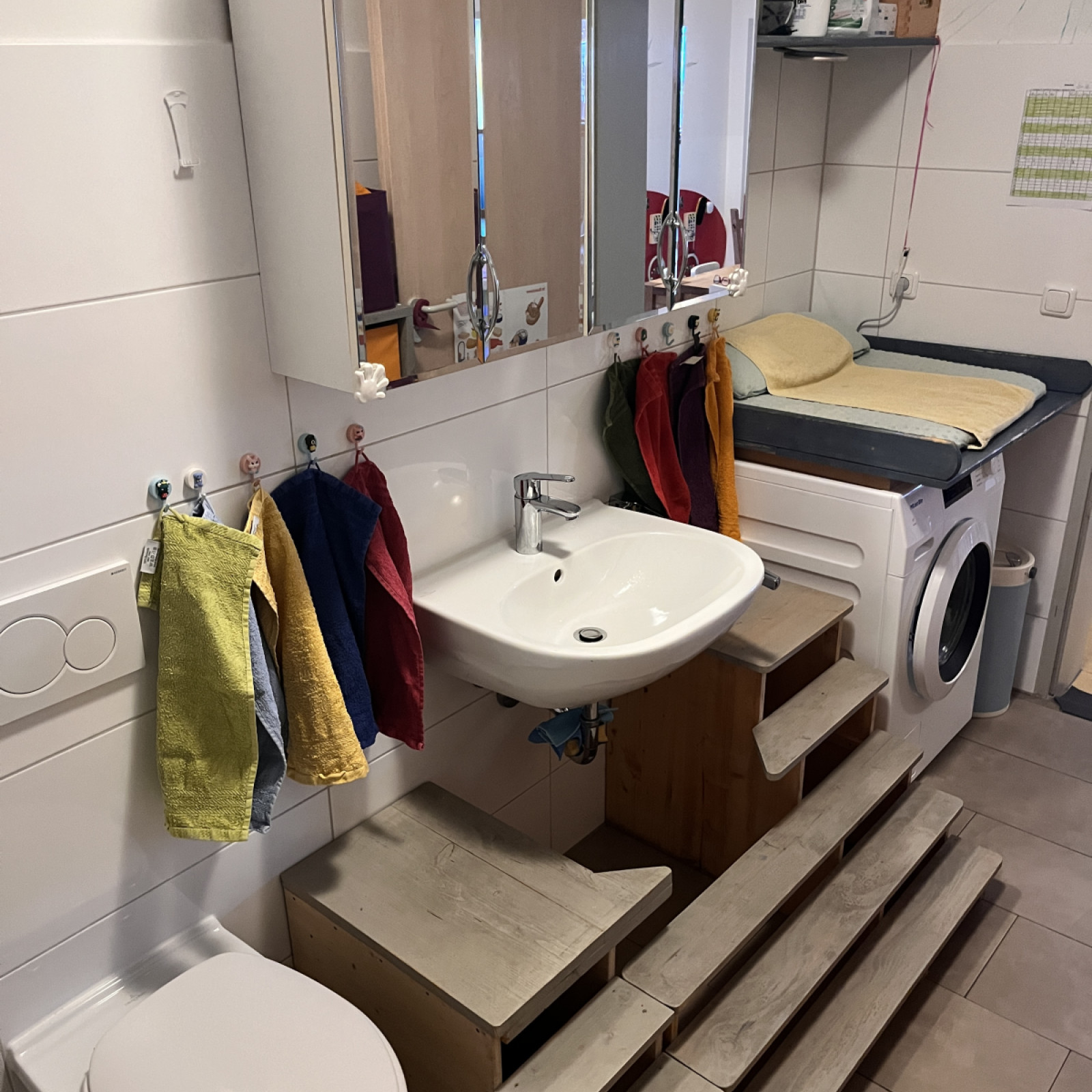 Wenn die Großen trocken werden, haben wir ausreichend Töpfchen und einen WC-Sitz zur Verfügung. Zum Händewaschen hängen niedrige Waschbecken an der Badewanne. Jedes Kind hat sein eigenes Handtuch in seiner Farbe!